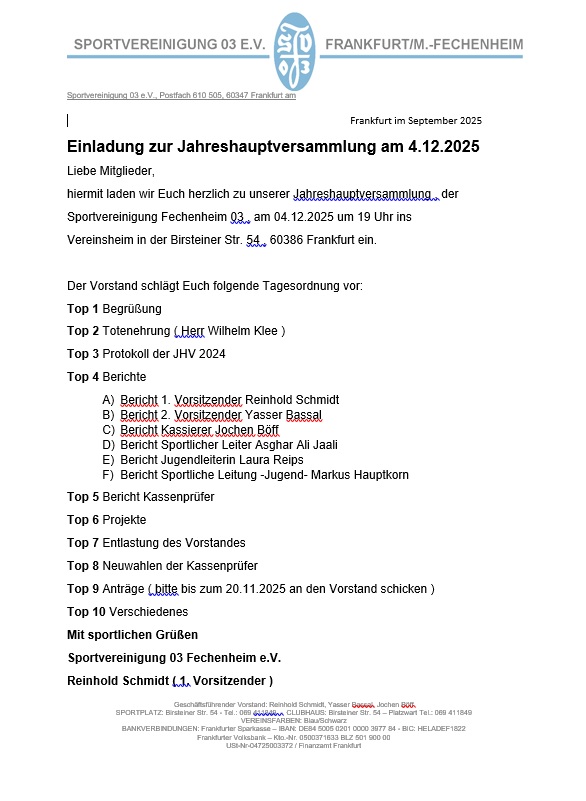 Wir laden unsere Mitglieder zu unserer Jahreshauptversammlung am 04.12.2025 ein. Diese findet in unserem Vereinsheim in der Birsteiner Str. 54, 60386 Frankfurt statt und beginnt um 19:00 Uhr.